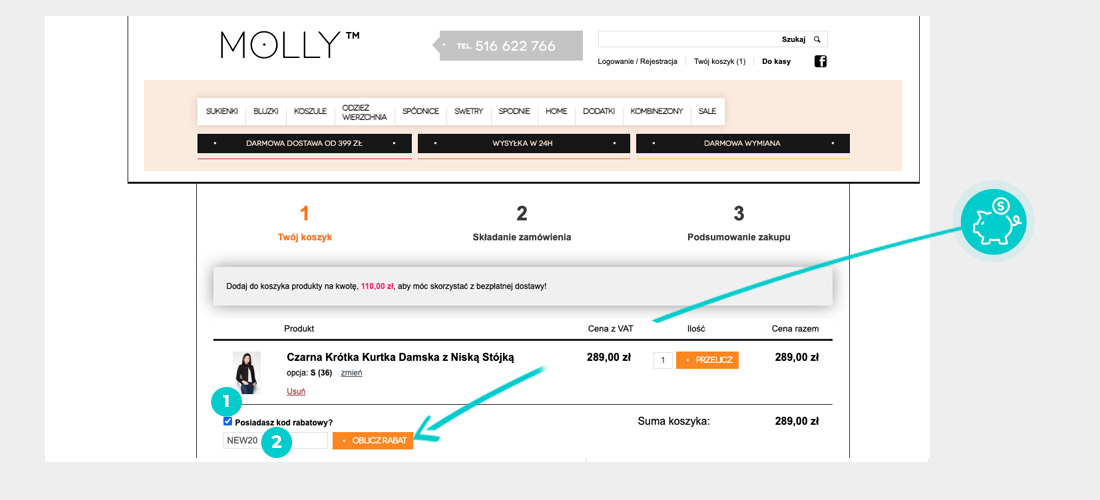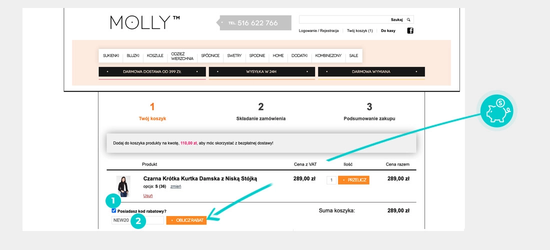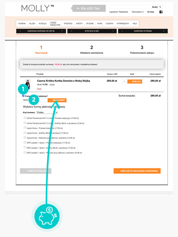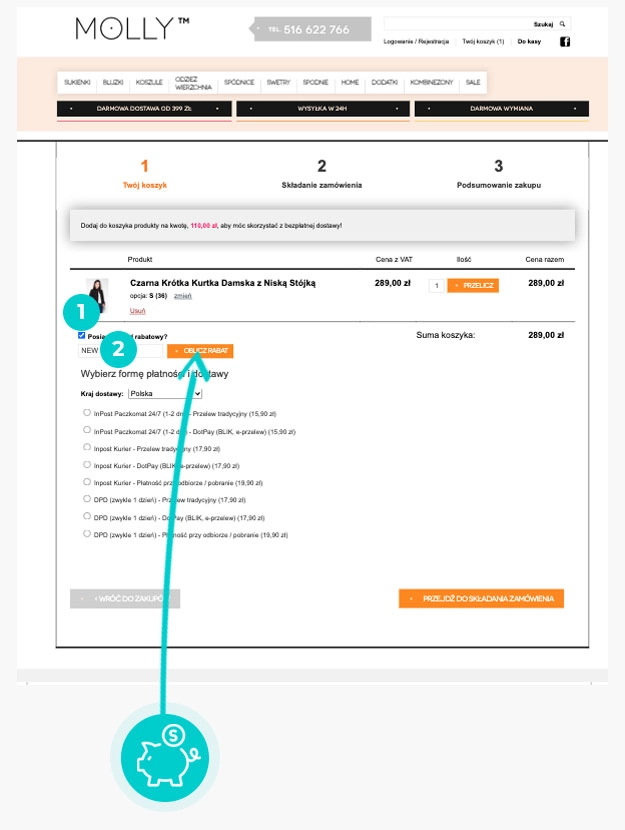 Nie wiesz dokładnie, jak działają kody rabatowe na Molly.pl? Oto jak szybko i łatwo zastosować kody rabatowe podczas dokonywania zakupu: