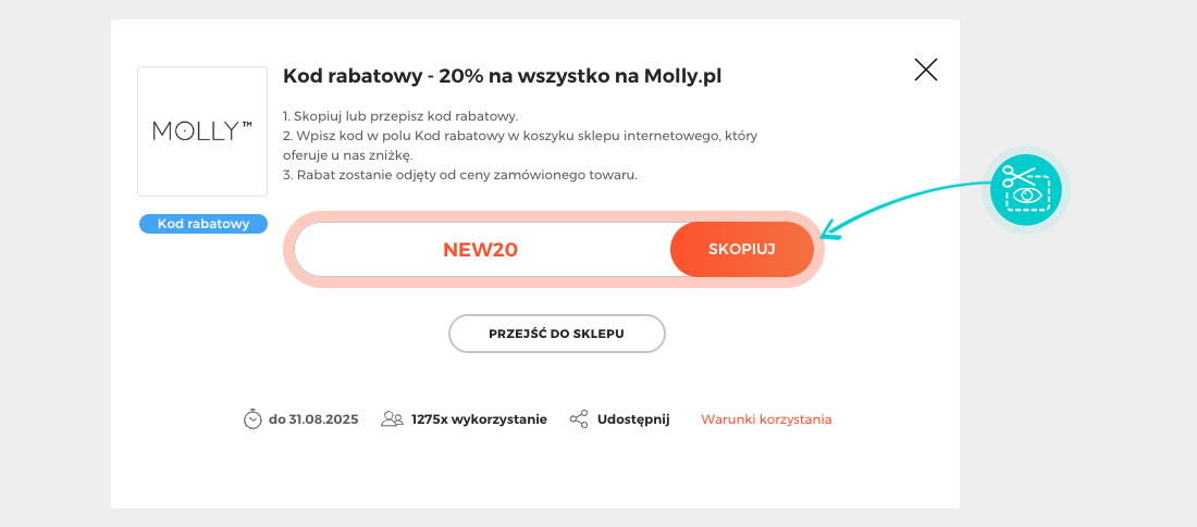 Skopiuj lub zapisz kod rabatowy i kliknij przycisk "Przejdź do sklepu". Nastąpi przekierowanie bezpieśrednio do sklepu internetowego Molly.pl.