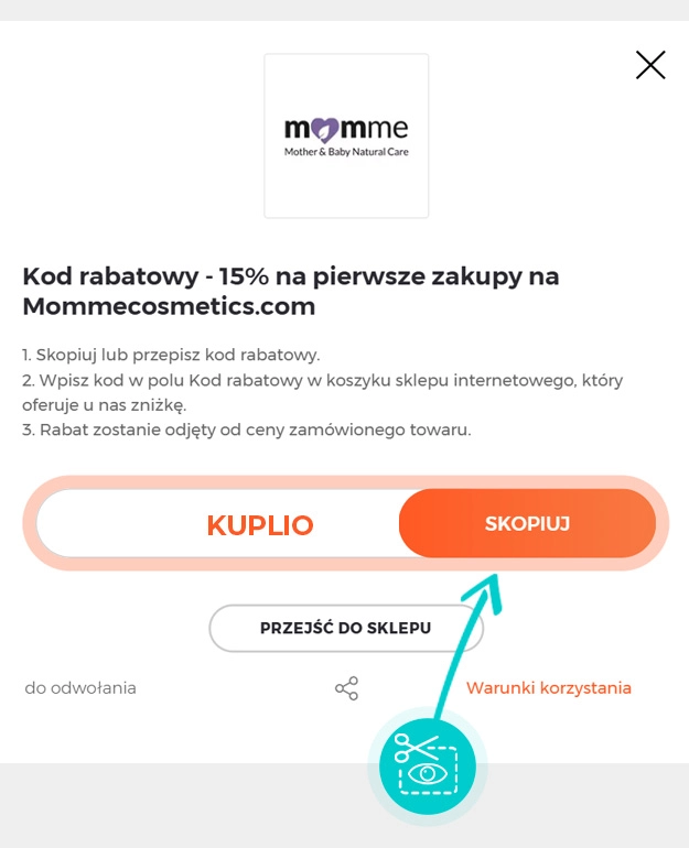 Skopiujcie lub zapiszcie kod rabatowy, a następnie kliknijcie przycisk "Przejdź do sklepu". Zostaniecie automatycznie przekierowani do sklepu internetowego Mommecosmetics.com.