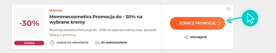 Wybierzcie konkretny rabat z Momme na naszej stronie i kliknijcie przycisk "Zobacz promocję". Zostaniecie automatycznie przekierowani do oferty promocyjnej w sklepie internetowym Mommecosmetics.com gdzie możecie kupić wybrany produkt ze świetną zniżką.