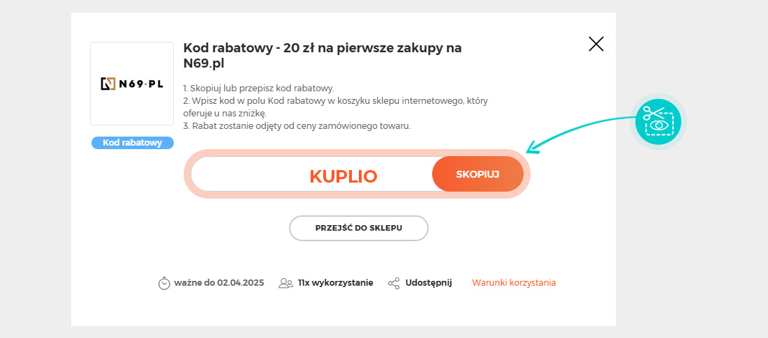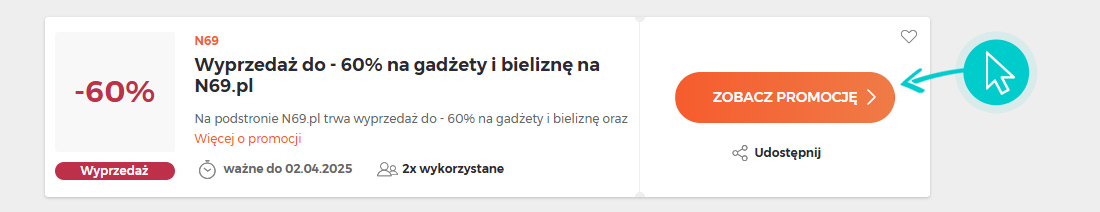 Wybierz konkretny rabat N69 na naszej stronie i kliknij przycisk "Zobacz promocje". Zostaniesz automatycznie przekierowany bezpośrednio do oferty specjalnej w sklepie internetowym N69.pl, w którym możesz kupić produkt ze zniżką.