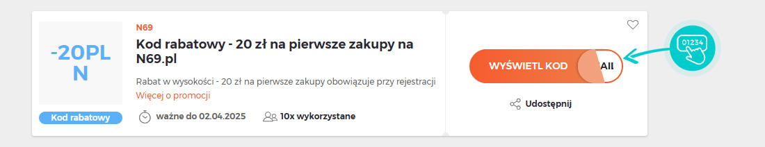 Wybierz na naszej stronie określony kod rabatowy, który chcesz zastosować w sklepie internetowym N69.pl. Kliknij pomarańczowy przycisk „Wyświetl kod”.