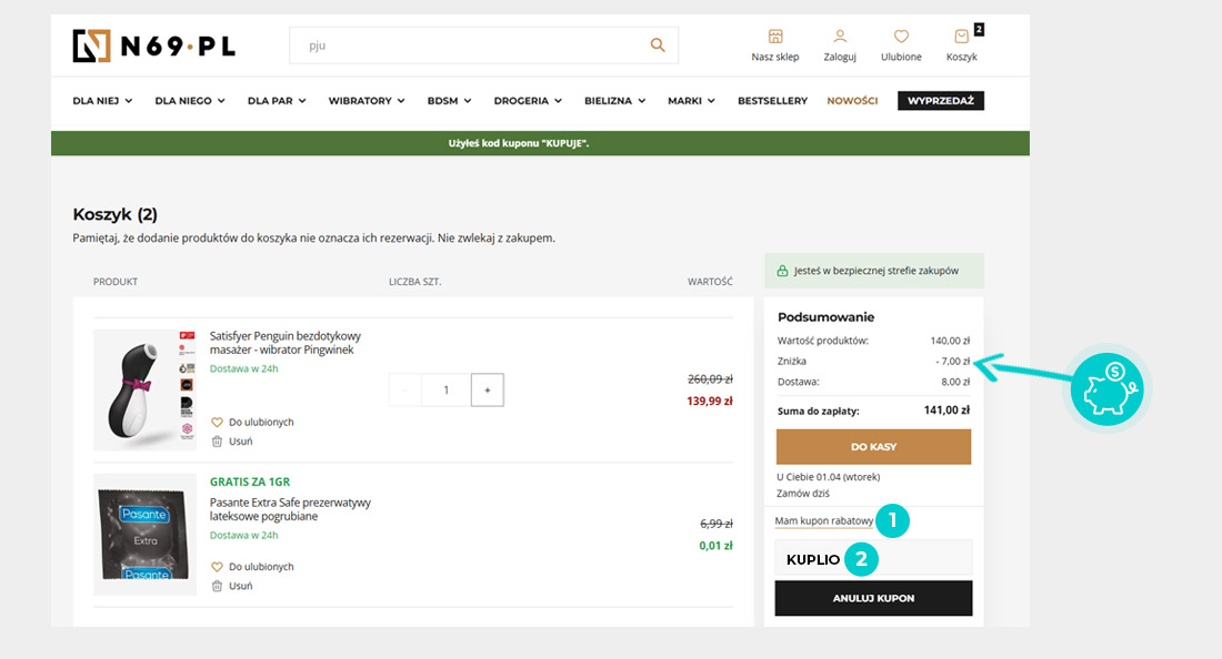 Wybierz produkt w e-sklepie N69.pl który Cię interesuje, naciśnij przycisk "Kup", a produkt zostanie automatycznie dodany do koszyka. Bezpośrednio w koszyku znajdziesz pole „Mam kupon rabatowy” pod wybranym produktem. Wpisz tutaj skopiowany kod rabatowy lub wprowadź go ręcznie i potwierdź przyciskiem „Do kasy”.