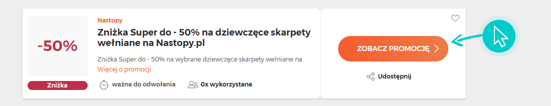 Wybierzcie na naszej stronie konkretny kod rabatowy, którego chcecie użyć w sklepie internetowym Nastopy. Następnie kliknijcie pomarańczowy przycisk "Wyświetl kod".