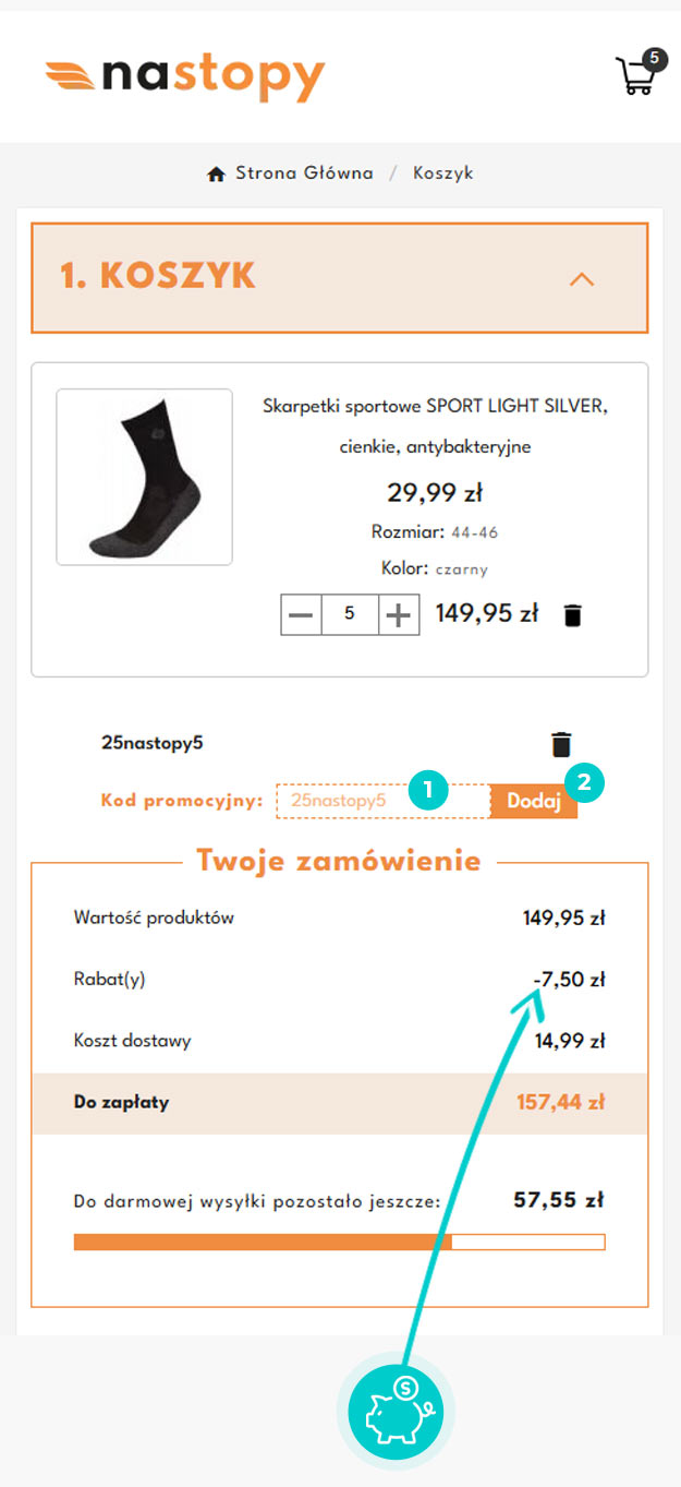 Wybierzcie w e-sklepie Nastopy produkt, który was interesuje, naciśnijcie przycisk "Dodaj do koszyka", a produkt automatycznie zostanie dodany do waszego koszyka z zamówieniem. Po prawej stronie, w sekcji "Koszyk" znajdziecie pole "Masz kod rabatowy?". Tutaj wklejcie skopiowany kod rabatowy bądź wprowadźcie go ręcznie, i zatwierdźcie przyciskiem "Zastosuj zniżkę", a następnie "Przejdź do kasy".