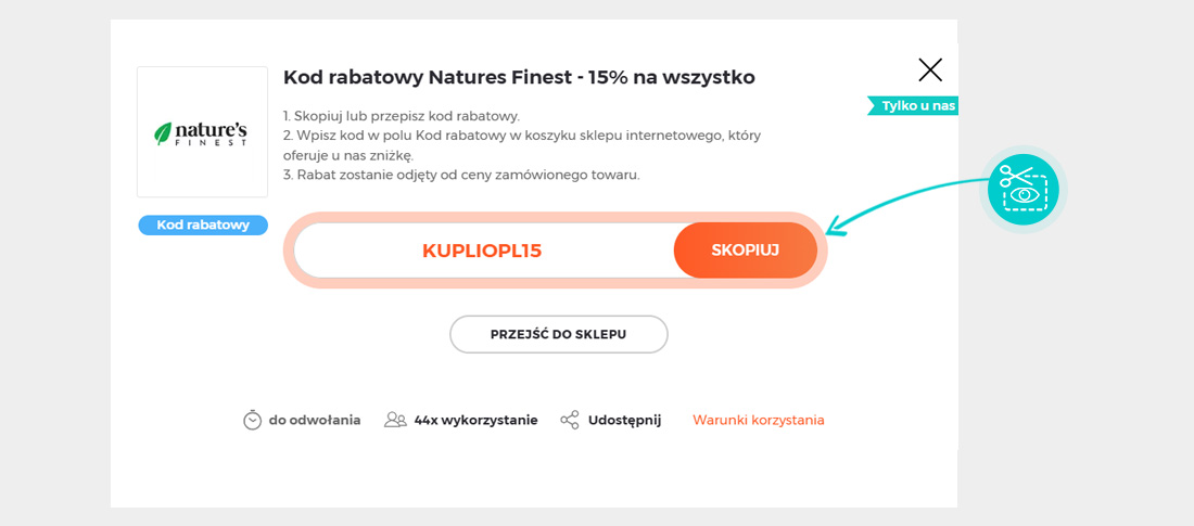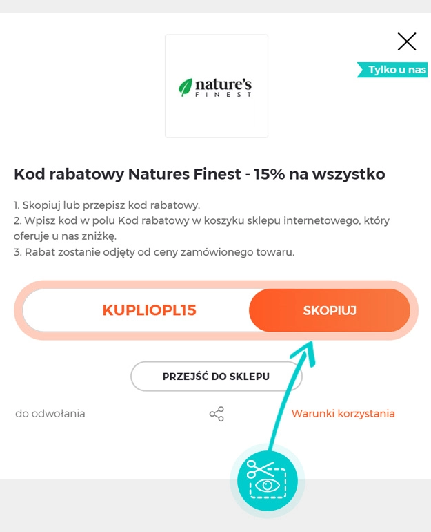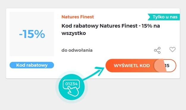 Skopiuj lub zapisz kod rabatowy i kliknij przycisk "Przejdź do sklepu". Nastąpi przekierowanie bezpieśrednio do sklepu internetowego Naturesfinest.pl.