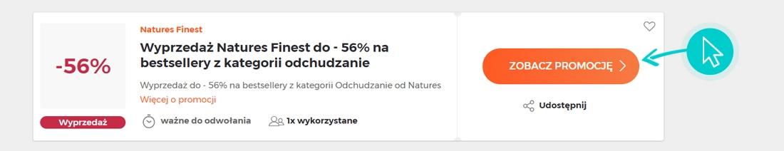 Wybierz konkretny rabat Natures Finest na naszej stronie i kliknij przycisk "Zobacz promocje". Zostaniesz automatycznie przekierowany bezpośrednio do oferty specjalnej w sklepie internetowym Naturesfinest.pl, w którym możesz kupić produkt ze zniżką.
