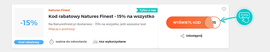 Wybierz na naszej stronie określony kod rabatowy, który chcesz zastosować w sklepie internetowym Naturesfinest.pl. Kliknij pomarańczowy przycisk „Wyświetl kod”.