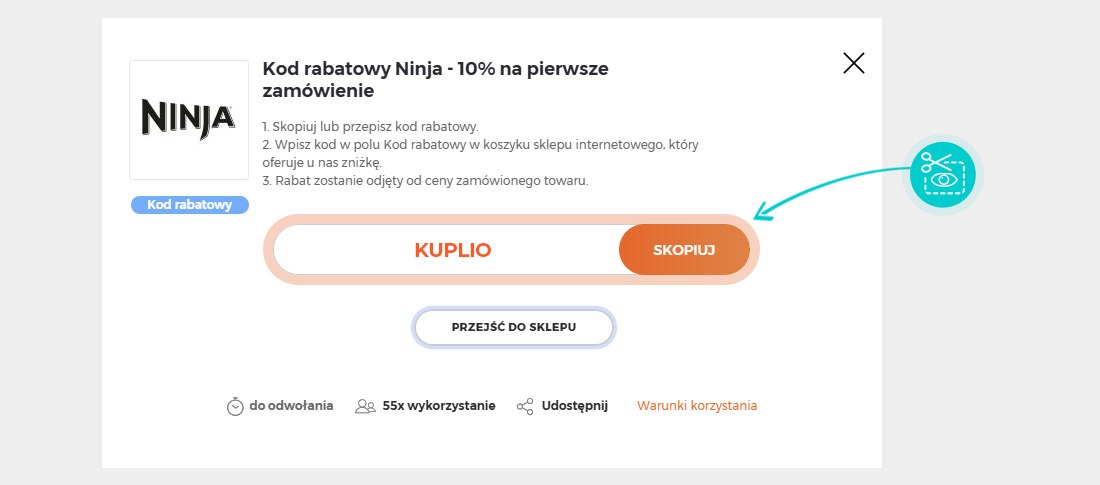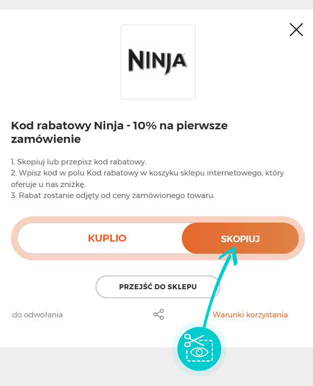 Skopiuj lub zapisz kod rabatowy i kliknij przycisk "Przejdź do sklepu". Nastąpi przekierowanie bezpieśrednio do sklepu internetowego Ninjakitchen.pl.