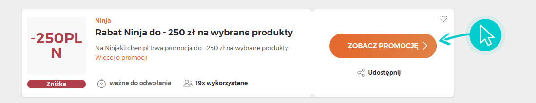 Wybierz konkretny rabat Ninja na naszej stronie i kliknij przycisk "Zobacz promocje". Zostaniesz automatycznie przekierowany bezpośrednio do oferty specjalnej w sklepie internetowym Ninjakitchen.pl, w którym możesz kupić produkt ze zniżką.