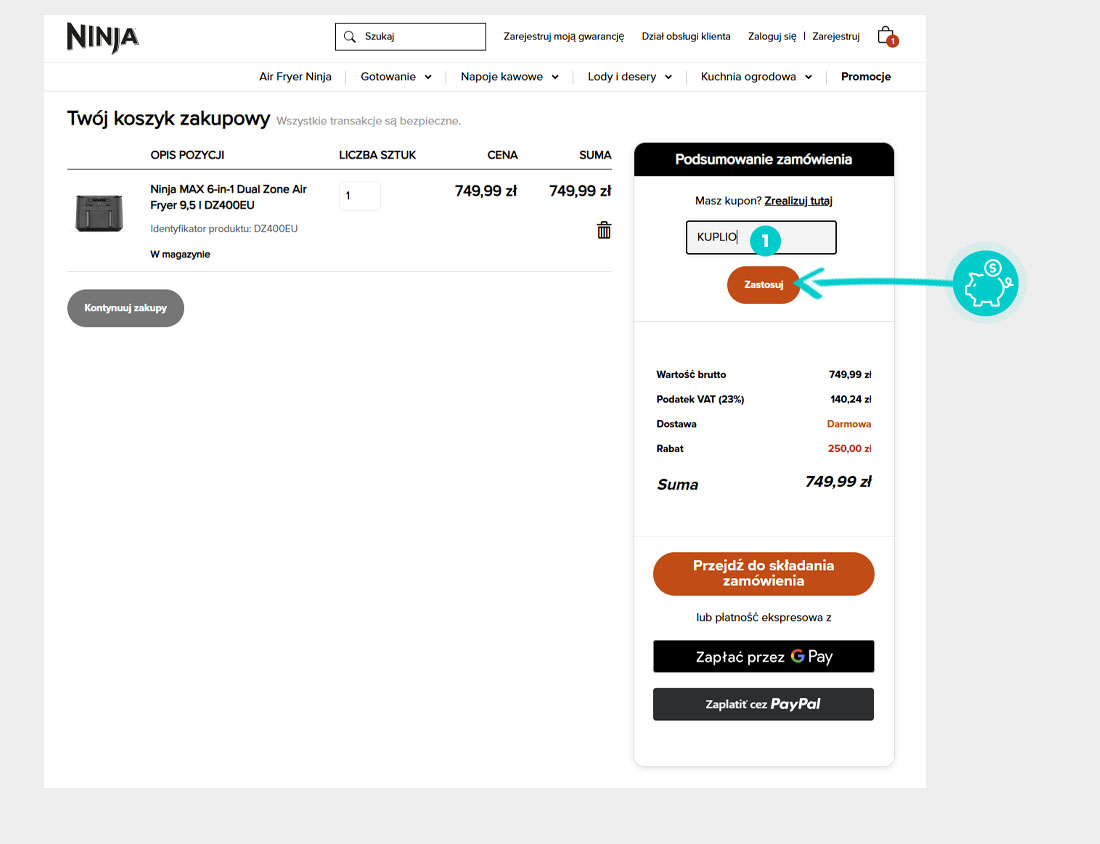 Wybierz produkt w e-sklepie Ninjakitchen.pl który Cię interesuje, naciśnij przycisk "Kup", a produkt zostanie automatycznie dodany do koszyka. Bezpośrednio w koszyku znajdziesz pole „Kupon podarunkowy lub rabatowy” pod wybranym produktem. Wpisz tutaj skopiowany kod rabatowy lub wprowadź go ręcznie i potwierdź przyciskiem „Zastosuj”.
