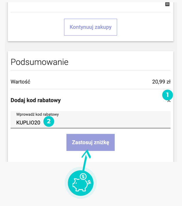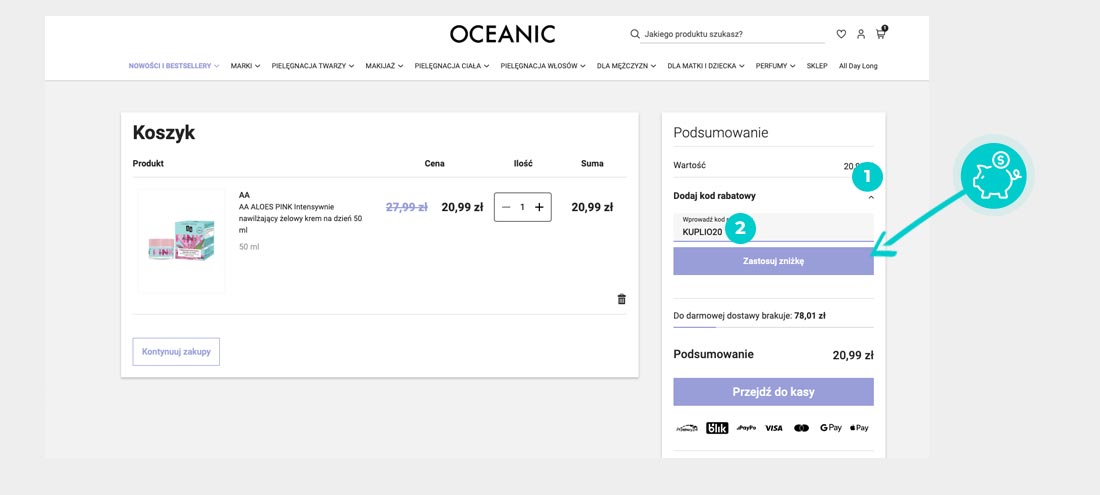 Wybierz produkt w e-sklepie Oceanic.pl który Cię interesuje, naciśnij przycisk "Kup", a produkt zostanie automatycznie dodany do koszyka. Bezpośrednio w koszyku znajdziesz pole „Kupon podarunkowy lub rabatowy” pod wybranym produktem. Wpisz tutaj skopiowany kod rabatowy lub wprowadź go ręcznie i potwierdź przyciskiem „Zastosuj”.
