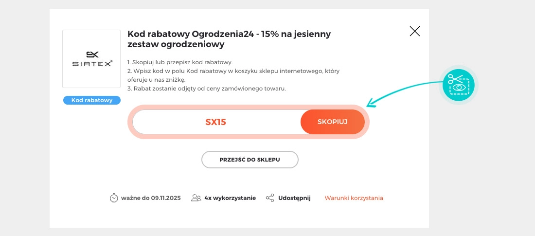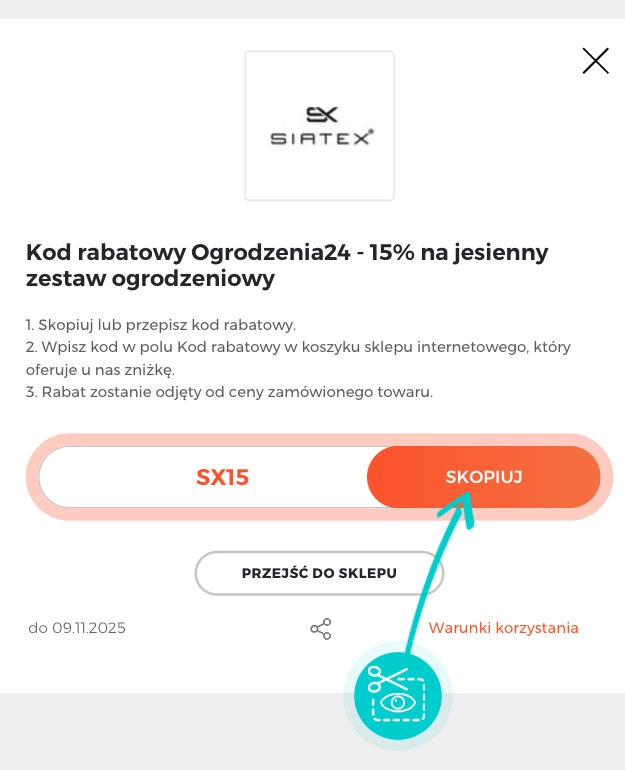 Skopiuj lub zapisz kod rabatowy i kliknij przycisk "Przejdź do sklepu". Nastąpi przekierowanie bezpieśrednio do sklepu internetowego Ogrodzenia24.eu.