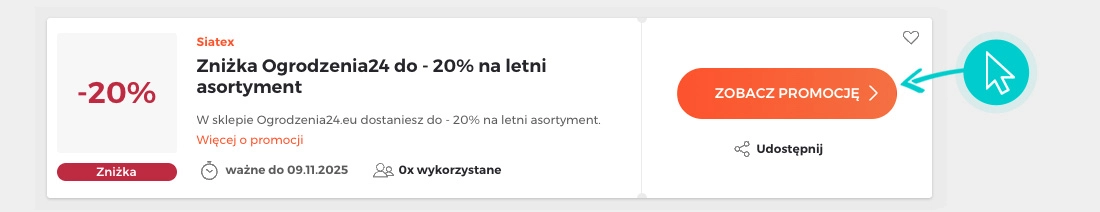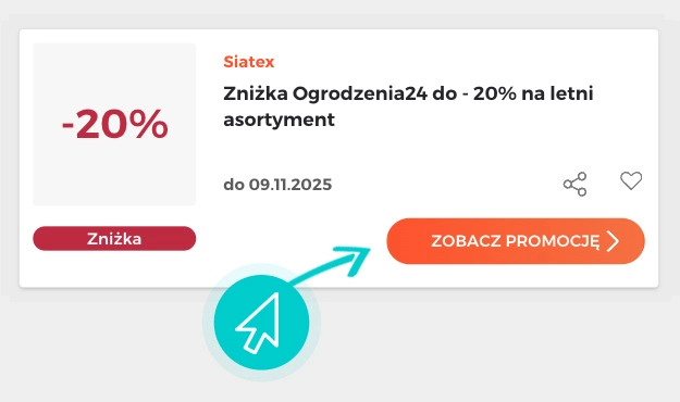 Wybierz konkretny rabat Ogrodzenia24 na naszej stronie i kliknij przycisk "Zobacz promocje". Zostaniesz automatycznie przekierowany bezpośrednio do oferty specjalnej w sklepie internetowym Ogrodzenia24.eu, w którym możesz kupić produkt ze zniżką.