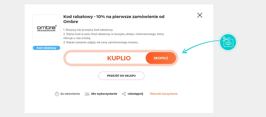 Wybierz na naszej stronie określony kod rabatowy, który chcesz zastosować w sklepie internetowym Ombre.pl. Kliknij pomarańczowy przycisk „Wyświetl kod”.