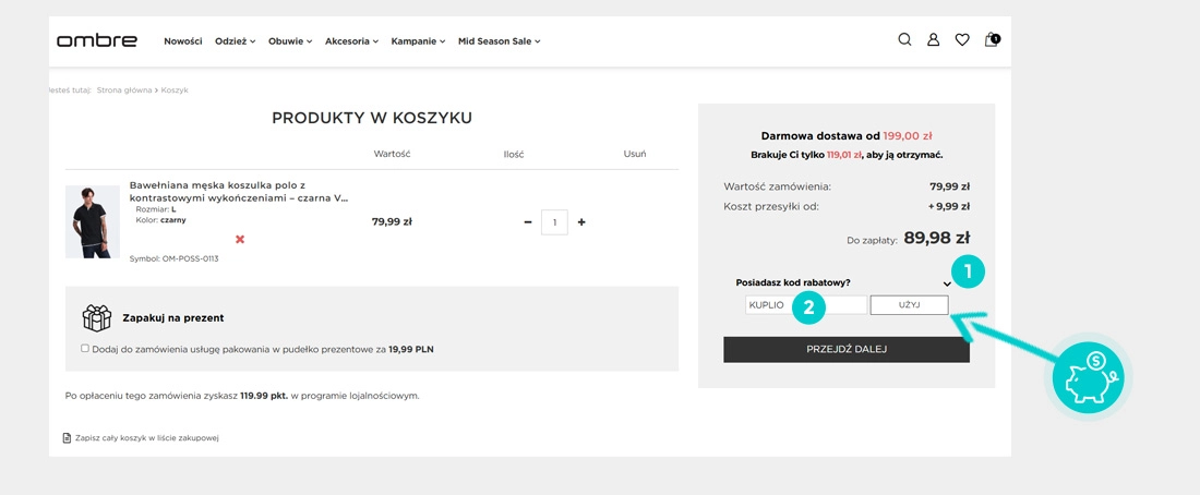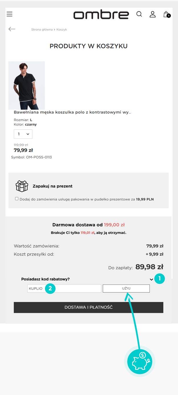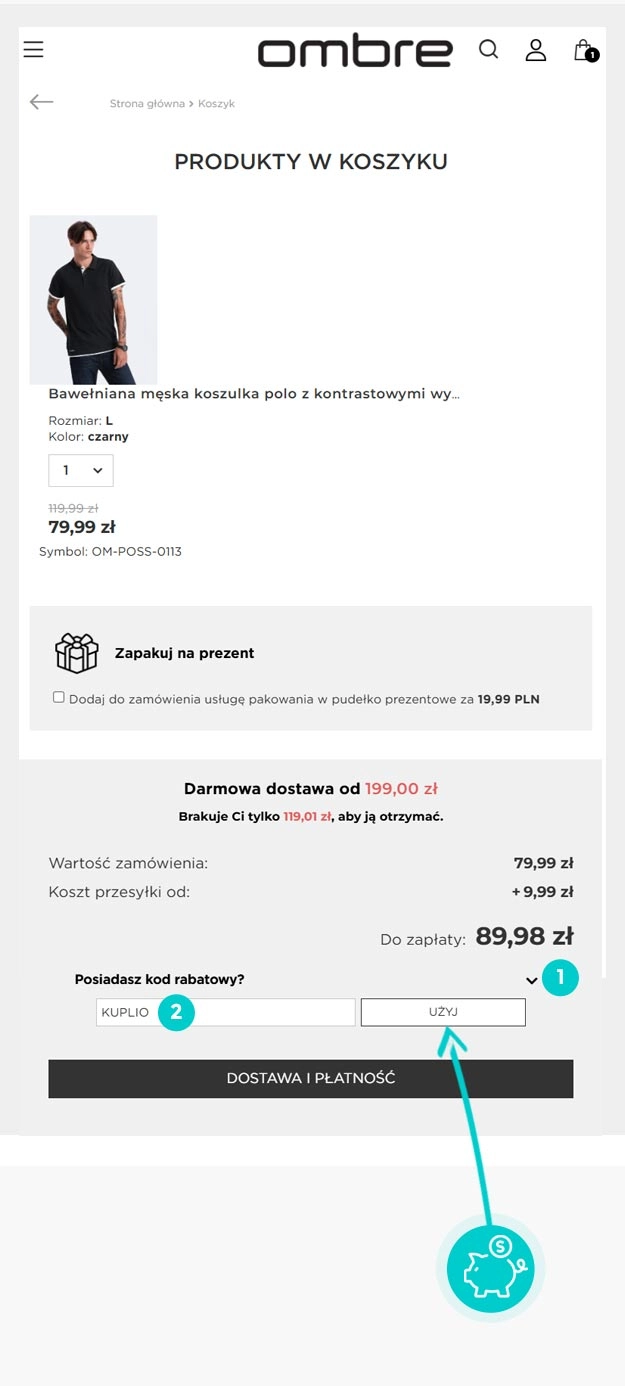 Wybierz produkt w e-sklepie Ombre.pl który Cię interesuje, naciśnij przycisk "Kup", a produkt zostanie automatycznie dodany do koszyka. Bezpośrednio w koszyku znajdziesz pole „Kupon podarunkowy lub rabatowy” pod wybranym produktem. Wpisz tutaj skopiowany kod rabatowy lub wprowadź go ręcznie i potwierdź przyciskiem „Zastosuj”.