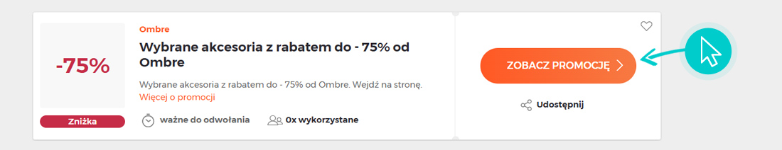 Wybierz konkretny rabat Ombre na naszej stronie i kliknij przycisk "Zobacz promocje". Zostaniesz automatycznie przekierowany bezpośrednio do oferty specjalnej w sklepie internetowym Ombre.pl, w którym możesz kupić produkt ze zniżką.
