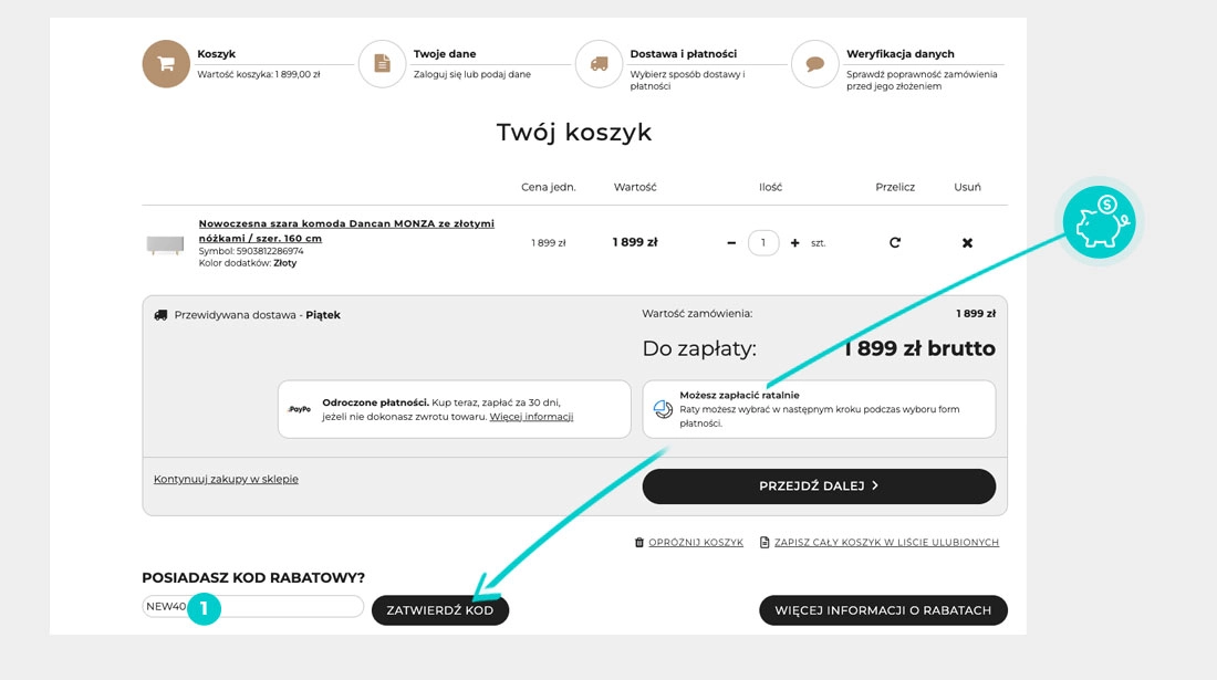 Tak, korzystanie z kodu rabatowego nie wiąże się z żadnymi kosztami. Wystarczy wpisać go w polu „Kod rabatowy” w koszyku, a system automatycznie naliczy zniżkę. To prosty sposób na obniżenie ceny zakupów.