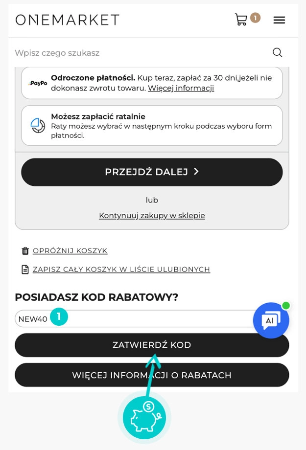 Skopiuj lub zapisz kod rabatowy i kliknij przycisk "Przejdź do sklepu". Nastąpi przekierowanie bezpieśrednio do sklepu internetowego Onemarket.pl.