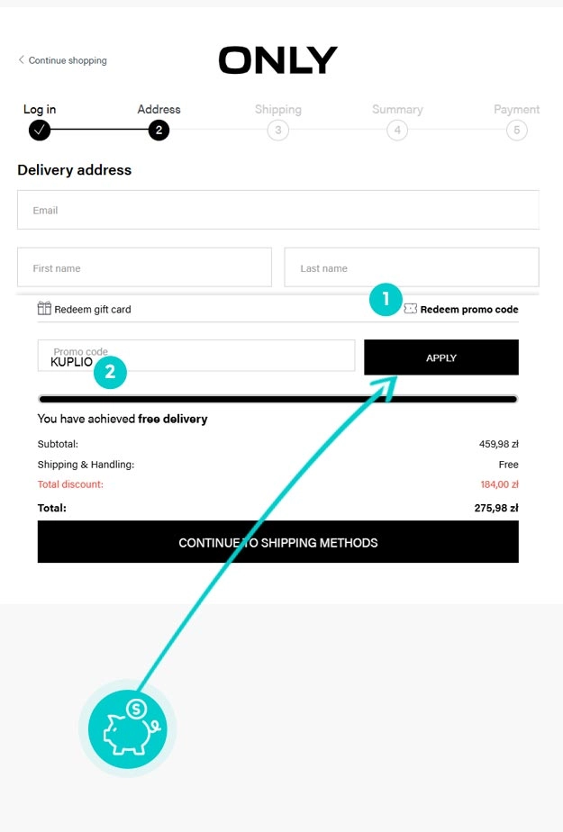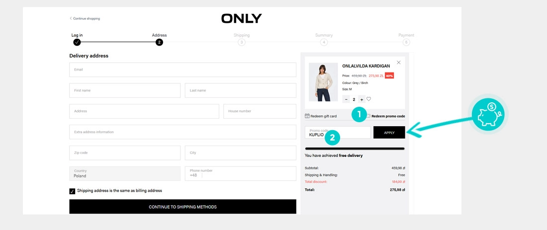 Wybierzcie w e-sklepie Only.com produkt, który was interesuje, naciśnijcie przycisk "Add to basket", a produkt automatycznie zostanie dodany do waszego koszyka z zamówieniem. Po prawej stronie, w sekcji "Checkout" znajdziecie pole "Redeem promo code". Tutaj wklejcie skopiowany kod rabatowy bądź wprowadźcie go ręcznie, i zatwierdźcie przyciskiem "Apply", a następnie "Continue to shipping methods".