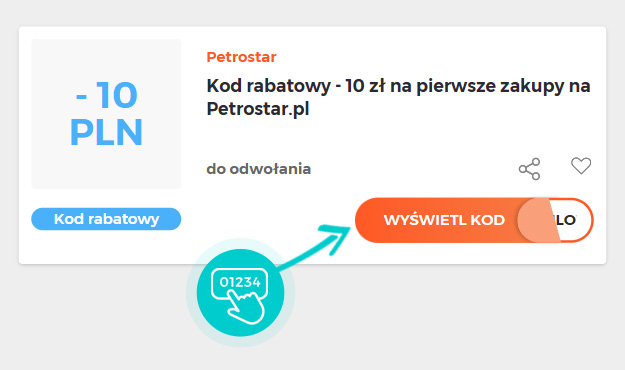 Wybierz na naszej stronie określony kod rabatowy, który chcesz zastosować w sklepie internetowym Petrostar.pl. Kliknij pomarańczowy przycisk „Wyświetl kod”.