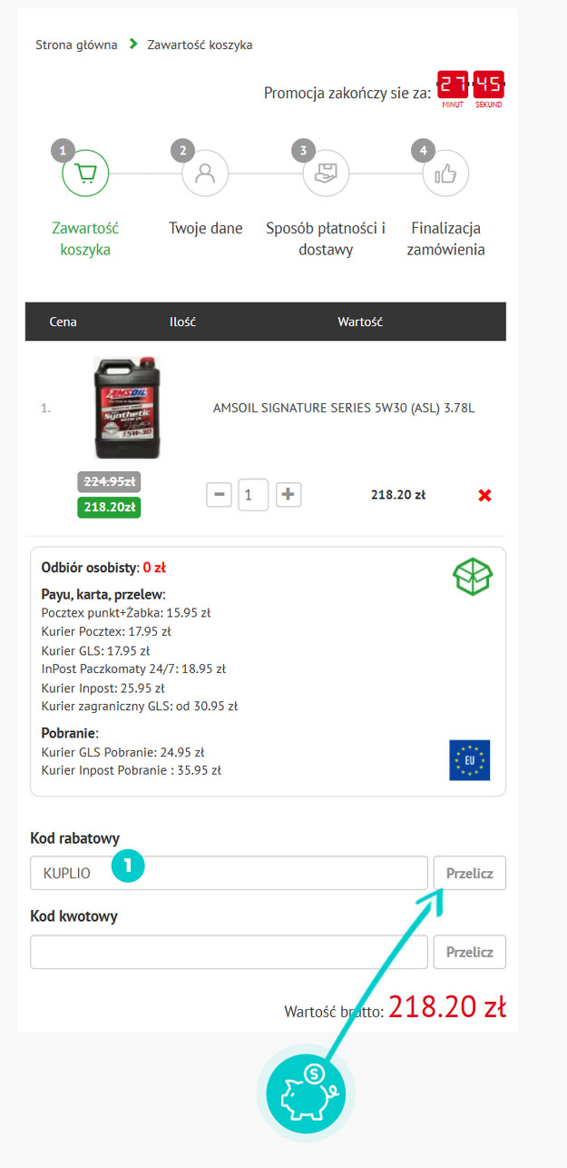 Wybierz produkt w e-sklepie Petrostar.pl który Cię interesuje, naciśnij przycisk "Kup", a produkt zostanie automatycznie dodany do koszyka. Bezpośrednio w koszyku znajdziesz pole „Kupon podarunkowy lub rabatowy” pod wybranym produktem. Wpisz tutaj skopiowany kod rabatowy lub wprowadź go ręcznie i potwierdź przyciskiem „Zastosuj”.