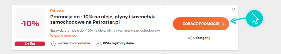 Wybierz konkretny rabat Petrostar na naszej stronie i kliknij przycisk "Zobacz promocje". Zostaniesz automatycznie przekierowany bezpośrednio do oferty specjalnej w sklepie internetowym Petrostar.pl, w którym możesz kupić produkt ze zniżką.