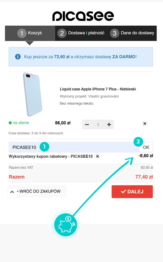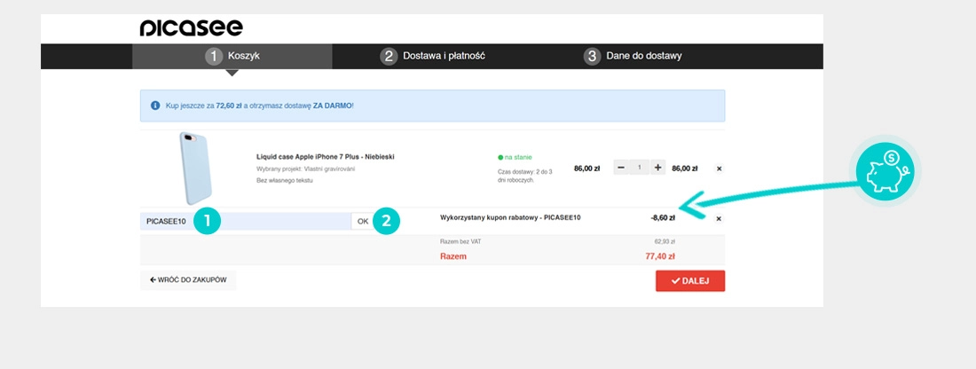 Wybierz produkt w e-sklepie Picasee.pl który Cię interesuje, naciśnij przycisk "Kup", a produkt zostanie automatycznie dodany do koszyka. Bezpośrednio w koszyku znajdziesz pole „Kupon podarunkowy lub rabatowy” pod wybranym produktem. Wpisz tutaj skopiowany kod rabatowy lub wprowadź go ręcznie i potwierdź przyciskiem „Zastosuj”.
