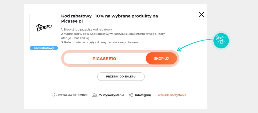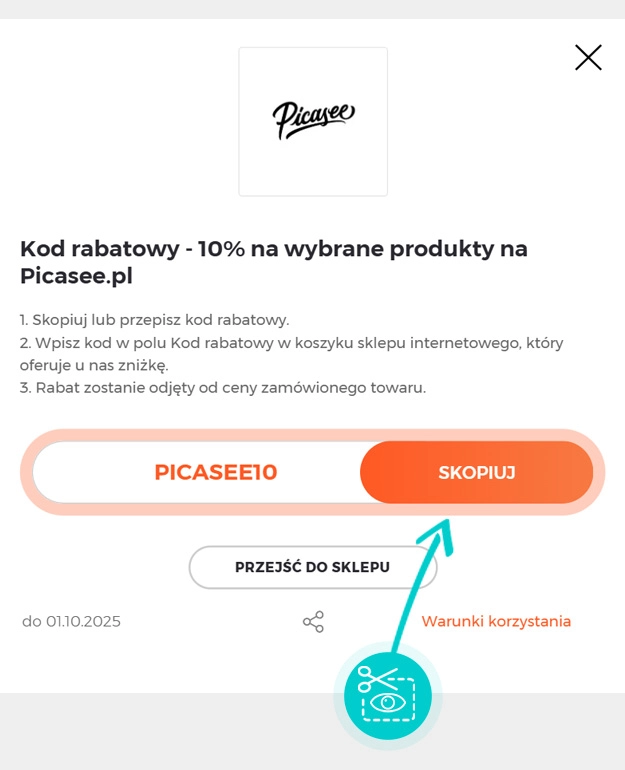 Skopiuj lub zapisz kod rabatowy i kliknij przycisk "Przejdź do sklepu". Nastąpi przekierowanie bezpieśrednio do sklepu internetowego Picasee.pl.