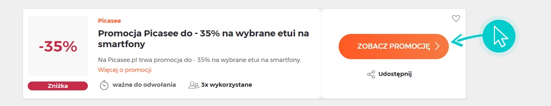 Wybierz konkretny rabat Picasee na naszej stronie i kliknij przycisk "Zobacz promocje". Zostaniesz automatycznie przekierowany bezpośrednio do oferty specjalnej w sklepie internetowym Picasee.pl, w którym możesz kupić produkt ze zniżką.