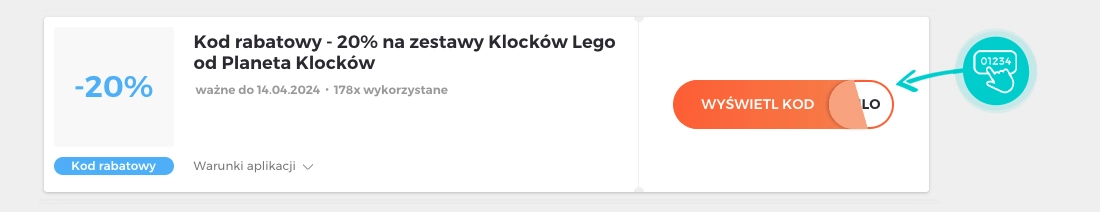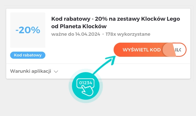 Wybierzcie na naszej stronie konkretny kod rabatowy, którego chcecie użyć w sklepie internetowym Planetaklockow.pl. Następnie kliknijcie pomarańczowy przycisk "Wyświetl kod".