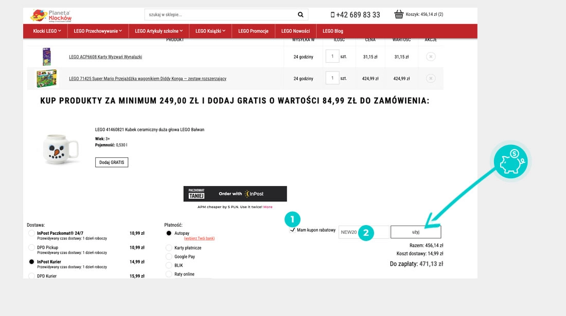 Wybierzcie w e-sklepie Planetaklockow.pl produkt, który was interesuje, naciśnijcie przycisk "Dodaj do koszyka", a produkt automatycznie zostanie dodany do waszego koszyka z zamówieniem. Po prawej stronie, w sekcji "Zawartość Twojego koszyka" znajdziecie pole "Mam kupon rabatowy". Tutaj wklejcie skopiowany kod rabatowy bądź wprowadźcie go ręcznie, i zatwierdźcie przyciskiem "Użyj", a następnie "Zamawiam".
