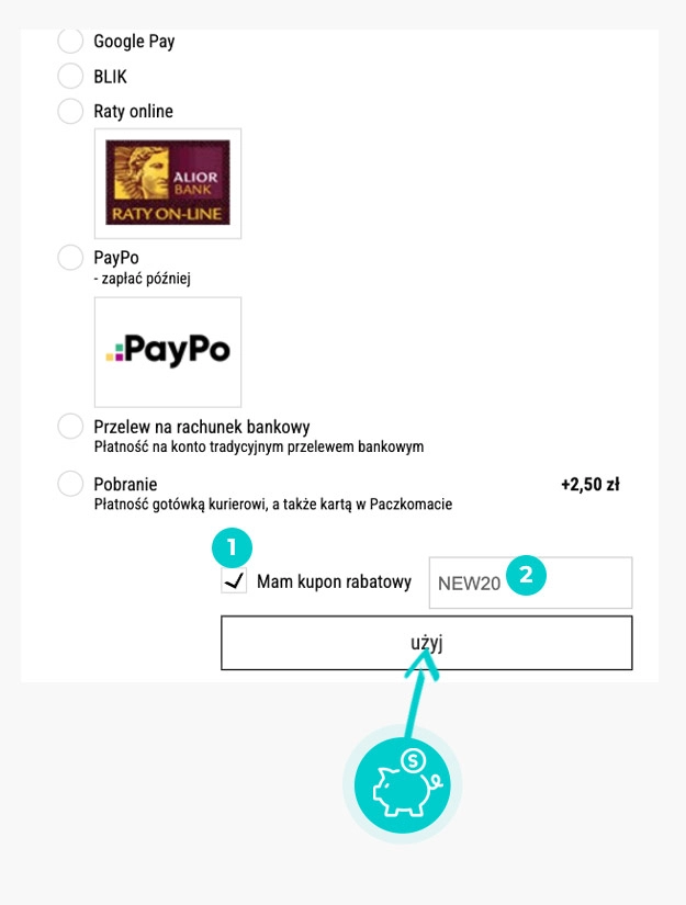 Kod rabatowy należy umieścić w pustym polu koszyka w trakcie kompletowania zamówienia, nie po zatwierdzeniu swoich zakupów. Nie śpieszcie się, będąc na etapie podsumowania i sprawdźcie kilka razy, czy uzupełniliście wszystkie luki, ponieważ w momencie, gdy pominiecie kod rabatowy i przejdziecie dalej, nie będziecie mogli się cofnąć.