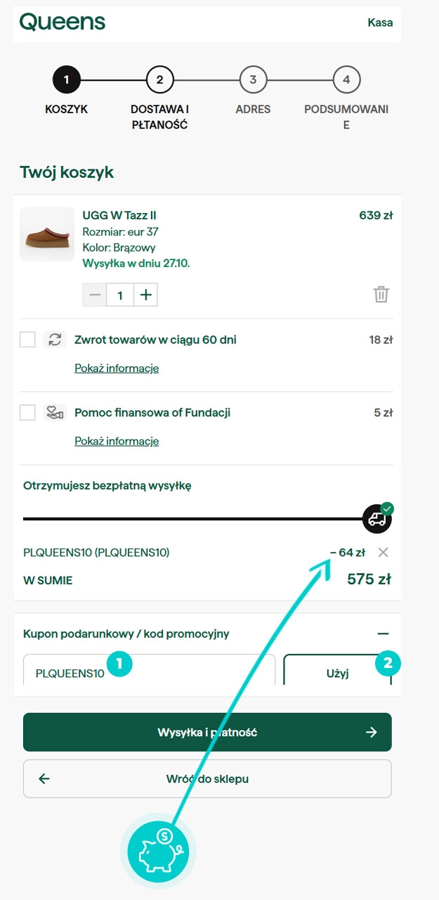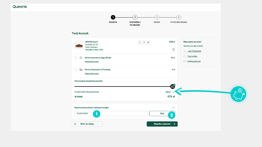 Wybierz produkt w e-sklepie Queens.com który Cię interesuje, naciśnij przycisk "Kup", a produkt zostanie automatycznie dodany do koszyka. Bezpośrednio w koszyku znajdziesz pole „Kupon podarunkowy lub rabatowy” pod wybranym produktem. Wpisz tutaj skopiowany kod rabatowy lub wprowadź go ręcznie i potwierdź przyciskiem „Zastosuj”.