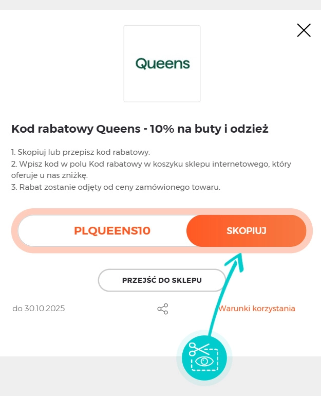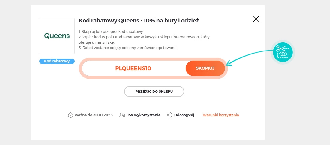 Skopiuj lub zapisz kod rabatowy i kliknij przycisk "Przejdź do sklepu". Nastąpi przekierowanie bezpieśrednio do sklepu internetowego Queens.com.
