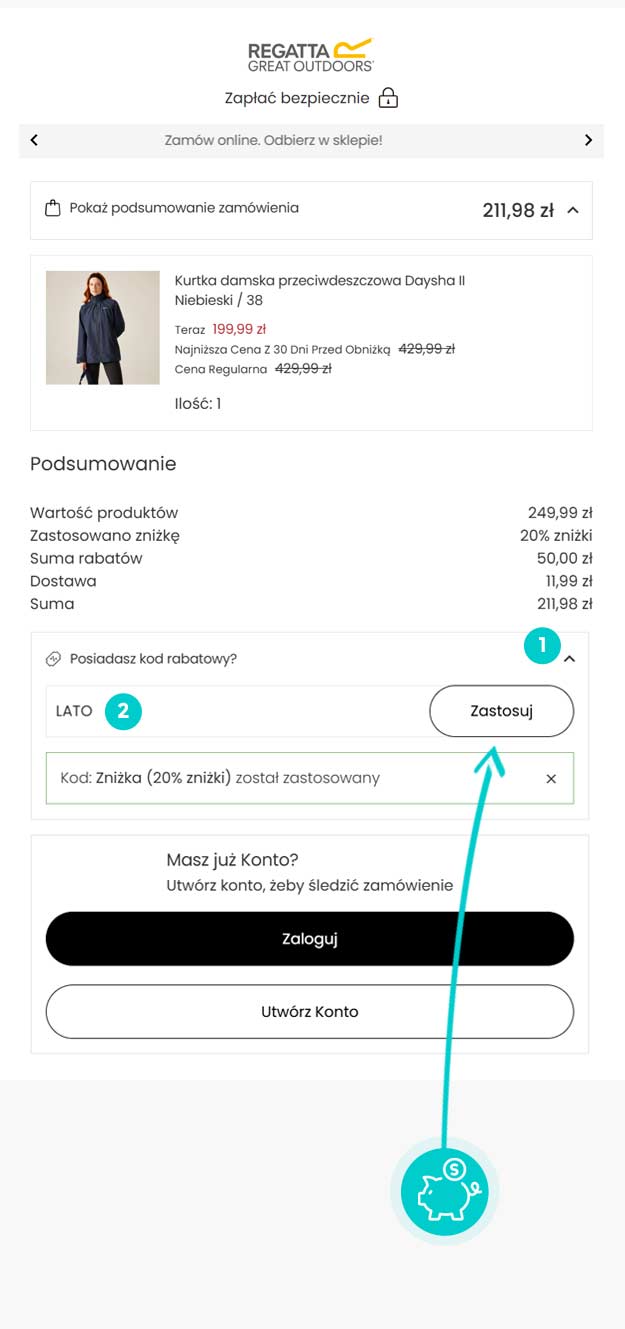 Wybierz produkt w e-sklepie Regatta.com który Cię interesuje, naciśnij przycisk "Kup", a produkt zostanie automatycznie dodany do koszyka. Bezpośrednio w koszyku znajdziesz pole „Kupon podarunkowy lub rabatowy” pod wybranym produktem. Wpisz tutaj skopiowany kod rabatowy lub wprowadź go ręcznie i potwierdź przyciskiem „Zastosuj”.