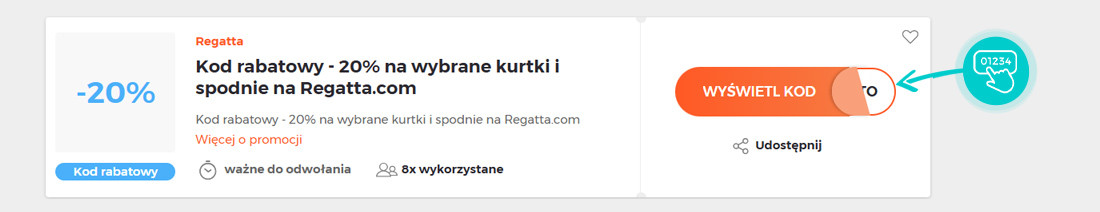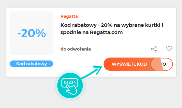 Wybierz na naszej stronie określony kod rabatowy, który chcesz zastosować w sklepie internetowym Regatta.com. Kliknij pomarańczowy przycisk „Wyświetl kod”.