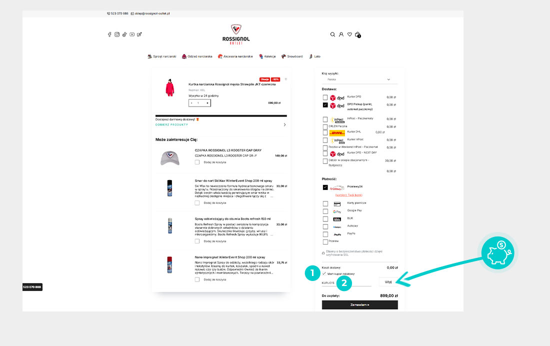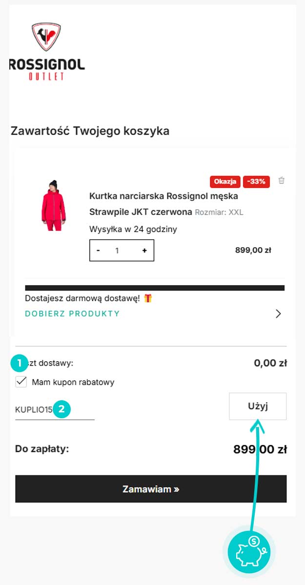 Wybierz w e-sklepie Rossignol.com produkt, który Cię interesuje, naciśnij przycisk "Dodaj do koszyka", a produkt automatycznie zostanie dodany do Twojego koszyka z zamówieniem. Po prawej stronie, w sekcji "Koszyk" znajdziesz pole "Mam kupon rabatowy". Tutaj wklej skopiowany kod rabatowy bądź wprowadź go ręcznie, i zatwierdź przyciskiem "Użyj", a następnie "Zamawiam".