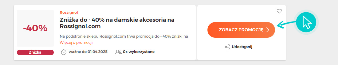 Wybierz konkretny rabat z Rossignol na naszej stronie i kliknij przycisk "Zobacz promocję". Zostaniesz automatycznie przekierowany do oferty promocyjnej w sklepie internetowym Rossignol.com, gdzie możesz kupić wybrany produkt ze świetną zniżką.