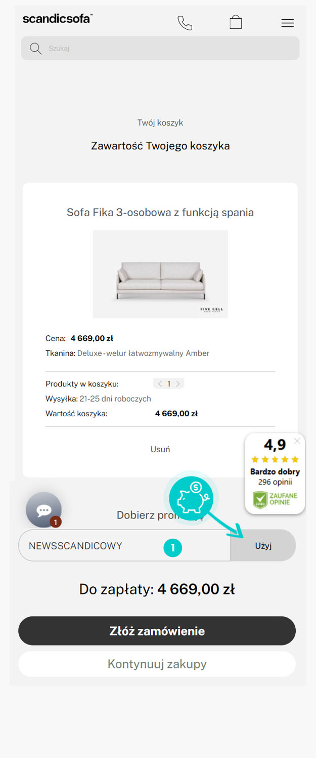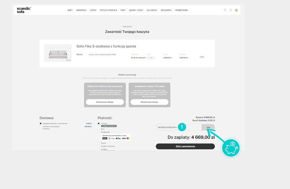 Wybierz produkt w e-sklepie ScandicSofa.pl który Cię interesuje, naciśnij przycisk "Kup", a produkt zostanie automatycznie dodany do koszyka. Bezpośrednio w koszyku znajdziesz pole „Kupon podarunkowy lub rabatowy” pod wybranym produktem. Wpisz tutaj skopiowany kod rabatowy lub wprowadź go ręcznie i potwierdź przyciskiem „Zastosuj”.