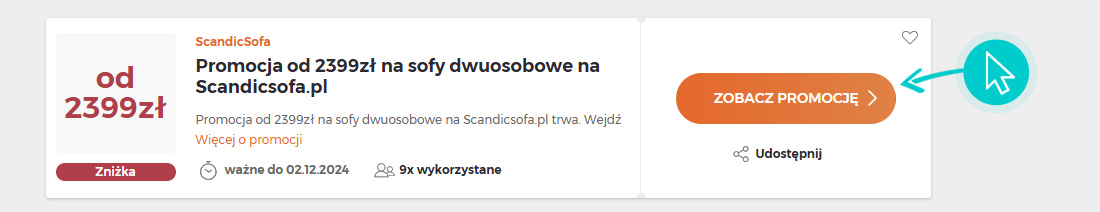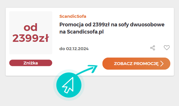 Wybierz konkretny rabat ScandicSofa na naszej stronie i kliknij przycisk "Zobacz promocje". Zostaniesz automatycznie przekierowany bezpośrednio do oferty specjalnej w sklepie internetowym ScandicSofa.pl, w którym możesz kupić produkt ze zniżką.