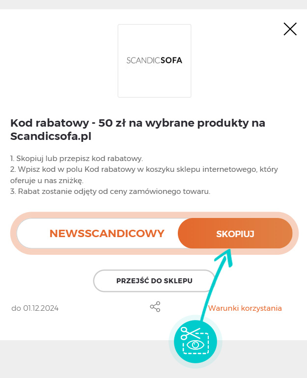 Skopiuj lub zapisz kod rabatowy i kliknij przycisk "Przejdź do sklepu". Nastąpi przekierowanie bezpieśrednio do sklepu internetowego ScandicSofa.pl.