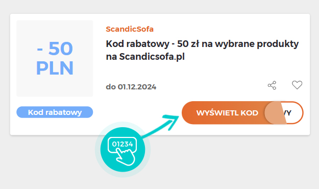 Wybierz na naszej stronie określony kod rabatowy, który chcesz zastosować w sklepie internetowym ScandicSofa.pl. Kliknij pomarańczowy przycisk „Wyświetl kod”.