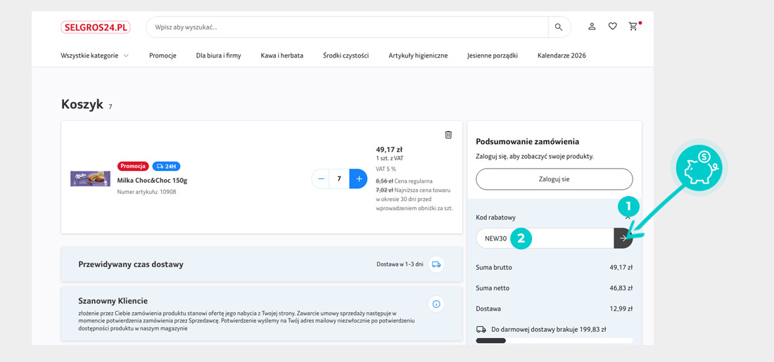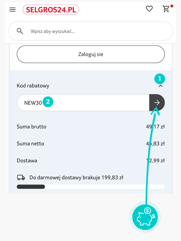 Wybierz w e-sklepie Selgros24.pl produkt, który Cię interesuje, naciśnij przycisk "Dodaj do koszyka", a produkt automatycznie zostanie dodany do Twojego koszyka z zamówieniem. Po prawej stronie, w sekcji "Koszyk" znajdziesz pole "Kod rabatowy". Tutaj wklej skopiowany kod rabatowy bądź wprowadź go ręcznie, i zatwierdź przyciskiem, a następnie zaznacz "Idż do kasy".