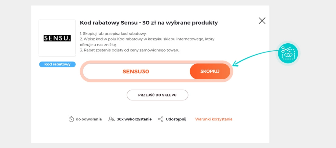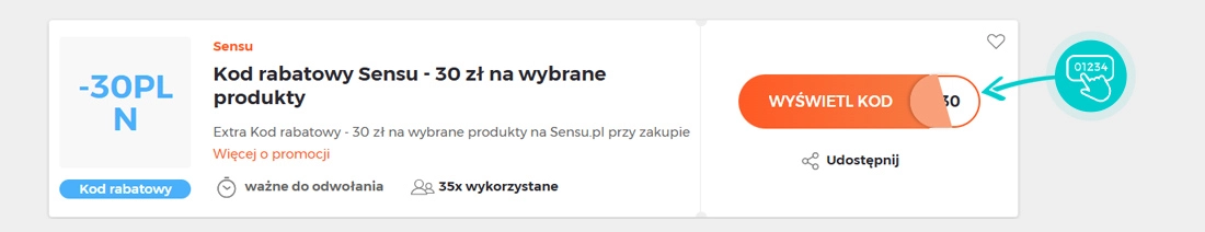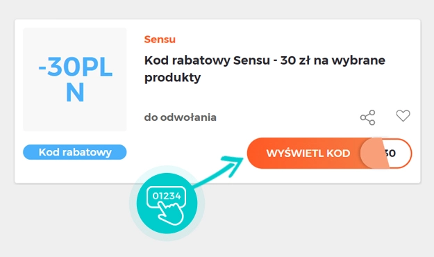 Wybierz na naszej stronie określony kod rabatowy, który chcesz zastosować w sklepie internetowym Sensu.pl. Kliknij pomarańczowy przycisk „Wyświetl kod”.