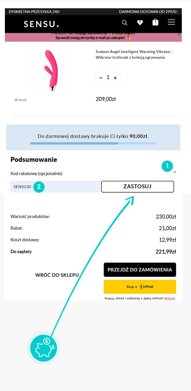 Wybierz produkt w e-sklepie Sensu.pl który Cię interesuje, naciśnij przycisk "Kup", a produkt zostanie automatycznie dodany do koszyka. Bezpośrednio w koszyku znajdziesz pole „Kupon podarunkowy lub rabatowy” pod wybranym produktem. Wpisz tutaj skopiowany kod rabatowy lub wprowadź go ręcznie i potwierdź przyciskiem „Zastosuj”.