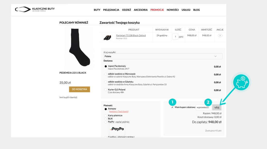 Wybierz produkt w e-sklepie Klasycznebuty.pl który Cię interesuje, naciśnij przycisk "Kup", a produkt zostanie automatycznie dodany do koszyka. Bezpośrednio w koszyku znajdziesz pole „Kupon podarunkowy lub rabatowy” pod wybranym produktem. Wpisz tutaj skopiowany kod rabatowy lub wprowadź go ręcznie i potwierdź przyciskiem „Zastosuj”.