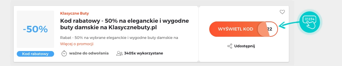 Wybierz na naszej stronie określony kod rabatowy, który chcesz zastosować w sklepie internetowym Klasycznebuty.pl. Kliknij pomarańczowy przycisk „Wyświetl kod”.