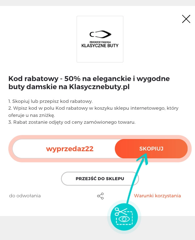 Skopiuj lub zapisz kod rabatowy i kliknij przycisk "Przejdź do sklepu". Nastąpi przekierowanie bezpieśrednio do sklepu internetowego Klasycznebuty.pl.