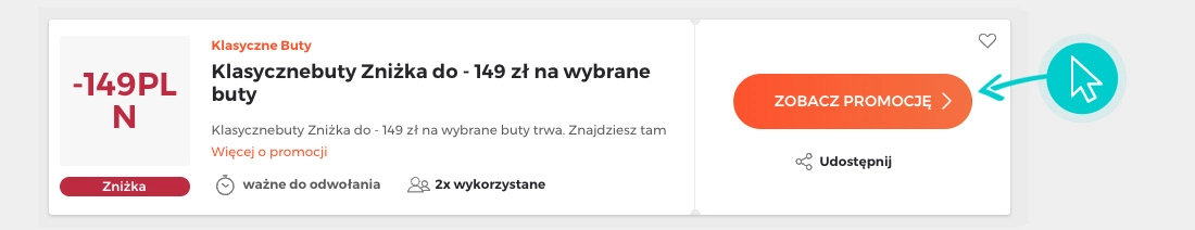 Wybierz konkretny rabat Klasyczne Buty na naszej stronie i kliknij przycisk "Zobacz promocje". Zostaniesz automatycznie przekierowany bezpośrednio do oferty specjalnej w sklepie internetowym Klasycznebuty.pl, w którym możesz kupić produkt ze zniżką.
